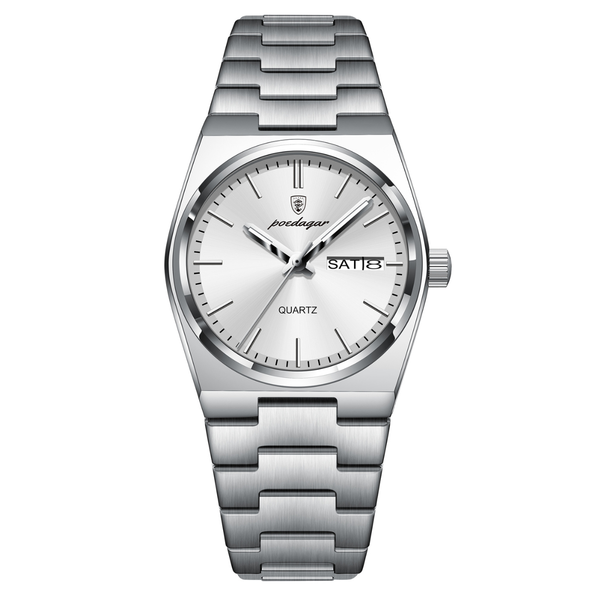 Zusätzlich zur Uhr erhalten Sie eine edle Präsentationsbox, ein Werkzeug zum Anpassen der Glieder, eine Garantiekarte sowie ein Feuchttuch zur Reinigung – alles, was Sie brauchen, um Ihre Uhr zu pflegen und stilvoll zu präsentieren.